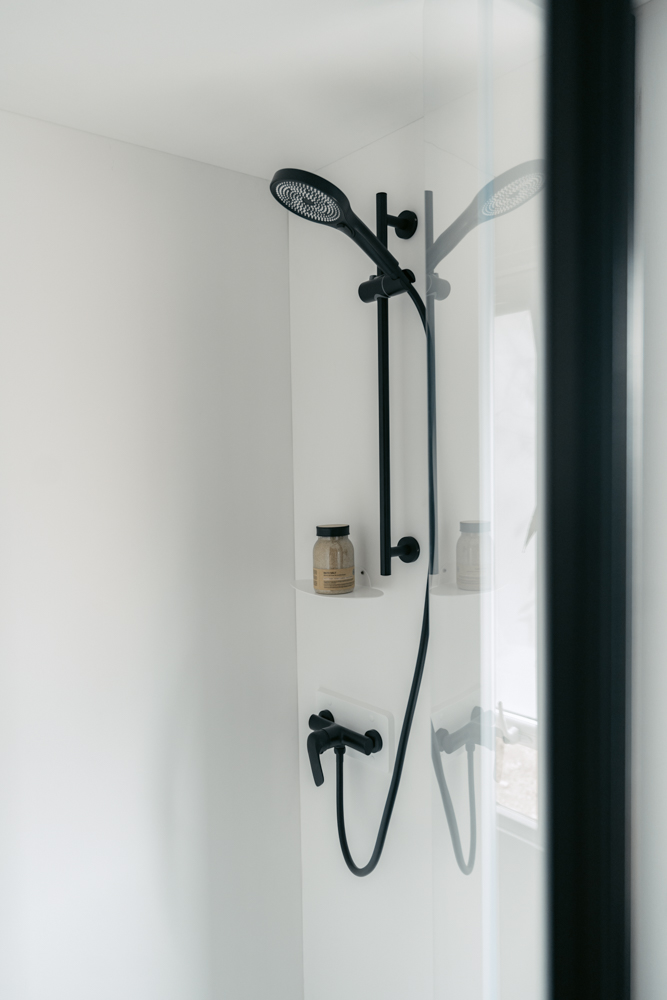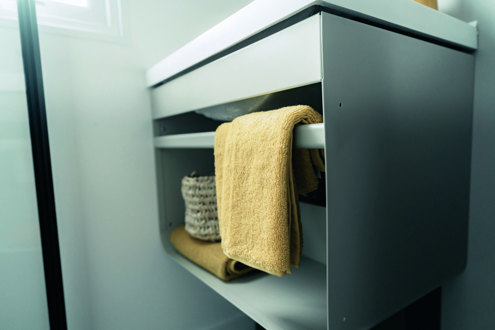 A casa de banho combina praticidade e conforto, com cabine de duche extra-plana, lavatório suspenso com toalheiro integrado, sanita com descarga dupla e radiador toalheiro.