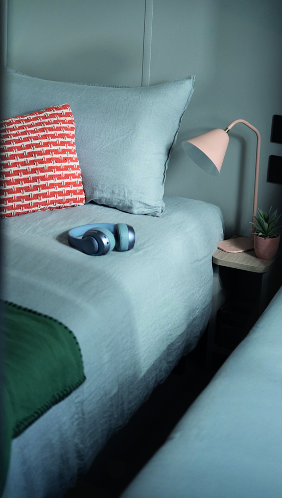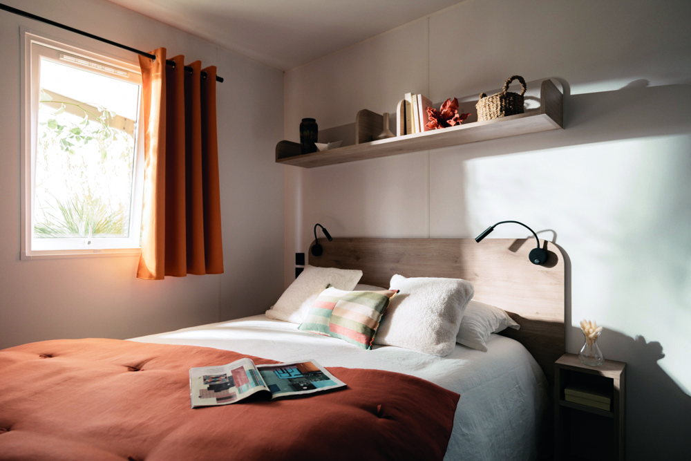 O quarto principal inclui cama de casal, cabeceira com espaço de arrumação, luzes de leitura, mesas de cabeceira, roupeiro tipo hotel e colchão HR 35 kg/m³ certificado OEKO TEX, com cortina opaca para maior privacidade e conforto térmico. O quarto das crianças ou de hóspedes dispõe de duas camas individuais, estrados elevados, colchões HR 35 kg/m³ e cortinas opacas, podendo integrar uma cama superior transversal para criar espaço adicional ou lugares extra para dormir.