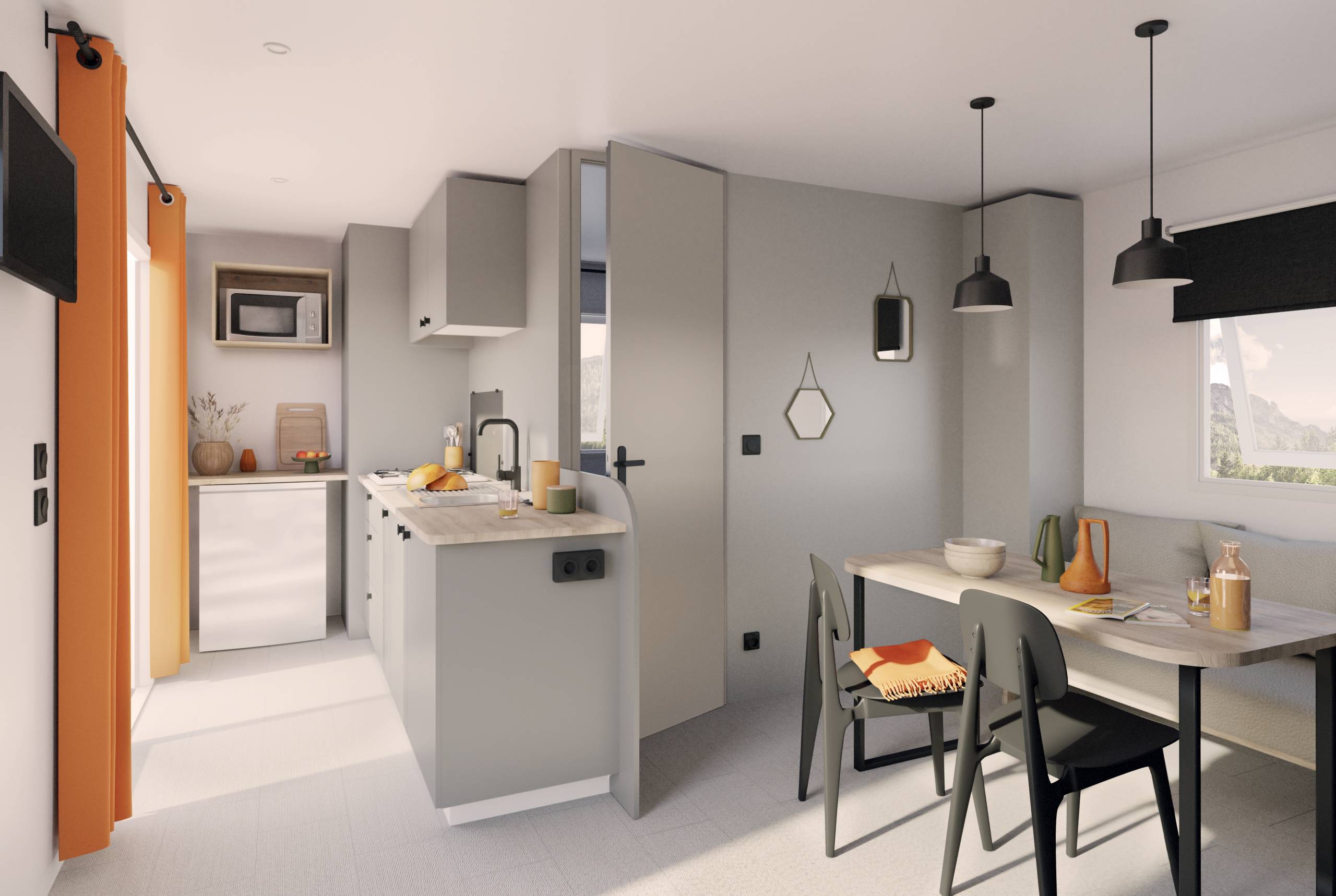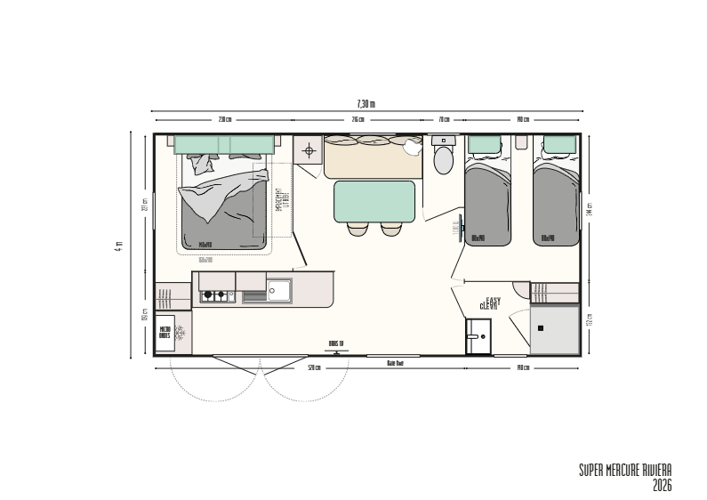 A IRM Super Mercure Riviera é uma casa móvel de 26,10 m², concebida para oferecer conforto, praticidade e excelente circulação, ideal para famílias ou para turismo e lazer. Com dimensões exteriores de 7,30 x 4,00 m e altura total de 3,47 m, este modelo destaca-se pelo conceito Riviera, que privilegia a luminosidade natural e a convivência, graças à cozinha em L aberta para a sala de estar e para o exterior. O layout foi cuidadosamente pensado para maximizar cada metro quadrado, criando uma casa funcional, acolhedora e fácil de manter.