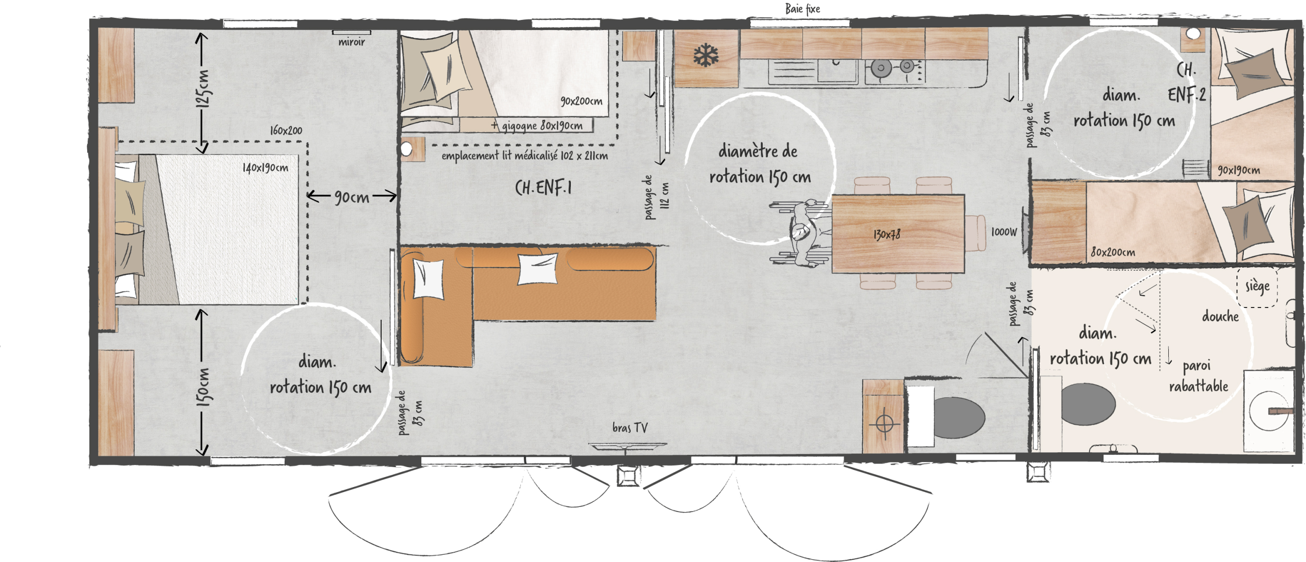 A O’Hara 1175 3CH é uma casa móvel de grandes dimensões que combina design moderno, conforto e soluções de acessibilidade. Com 50 m², apresenta uma distribuição inteligente que maximiza o espaço interior, oferecendo amplitude, praticidade e qualidade em todas as divisões. As portas de correr com vãos de 83 cm e as zonas de rotação de 150 cm garantem circulação fluida e facilidade de acesso em cada área da casa, enquanto o layout otimizado permite aproveitamento total do espaço.